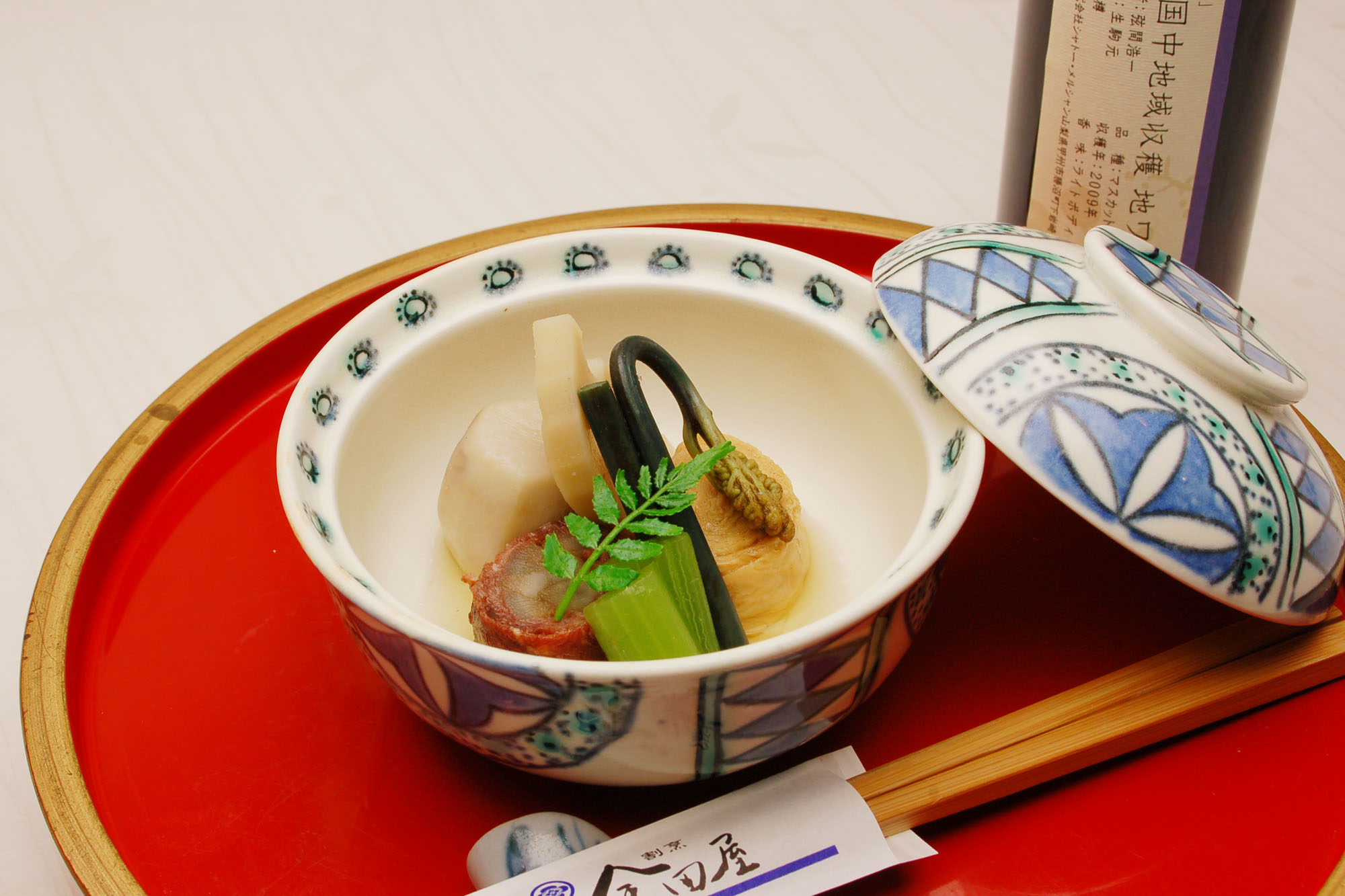 湯葉は油でさっと揚げてから鰹の出汁の良くきいた煮汁に含ませるとコクが出てとても美味しくなります。オランダ煮とも言います。牛肉やアナゴを牛蒡を芯にして巻いたものは八幡巻きと言います。その他、季節野菜の炊き合わせです。写真に少し見えているワインは「日本の地ワイン 山梨県国中地域収穫 マスカット・ベリーA 2009年」和食に合う日本のワインです。是非お試しください。