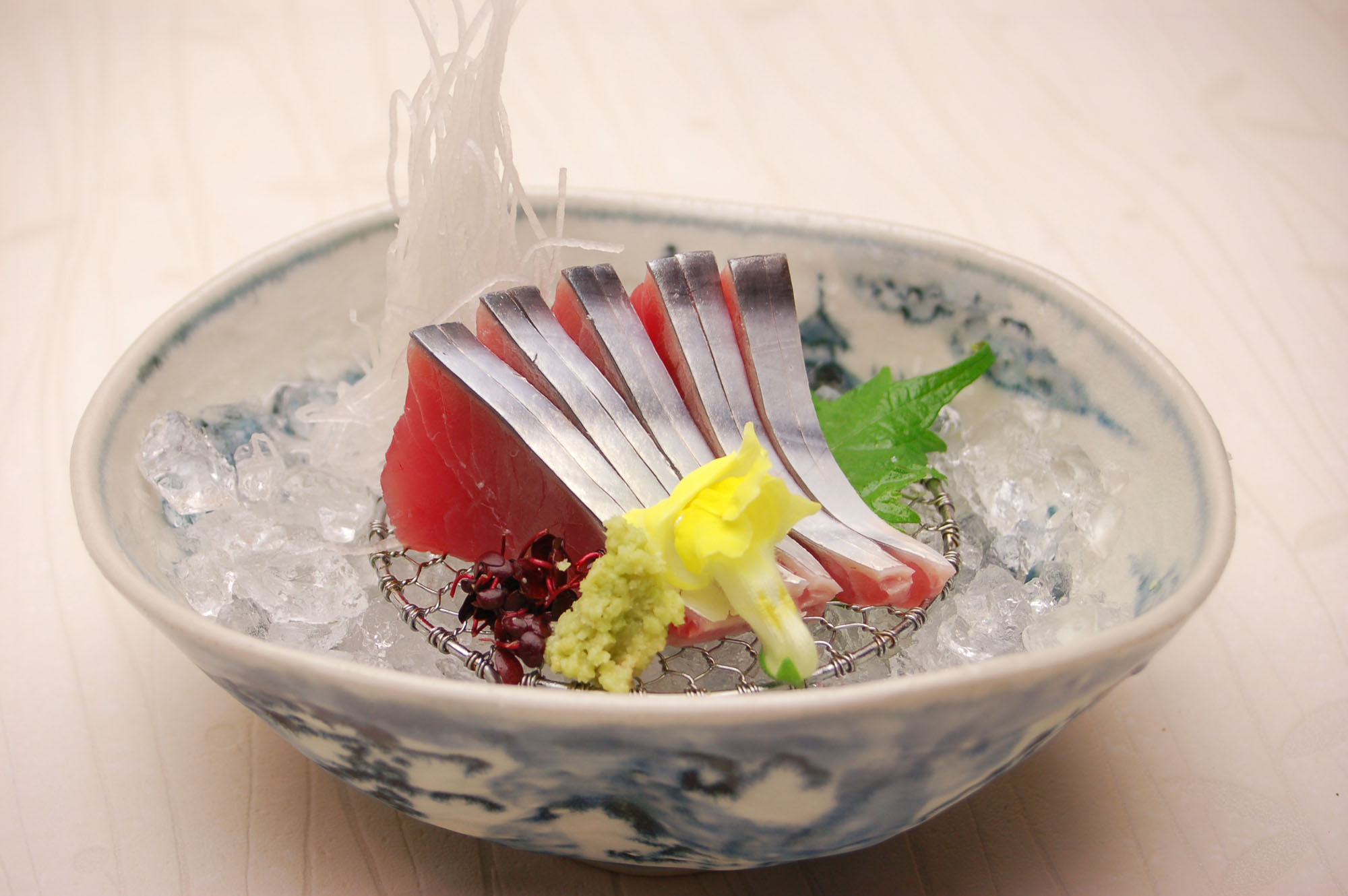 ●写真はカツオの腹側の色目を活かした銀皮造り、お湯をサッと掛