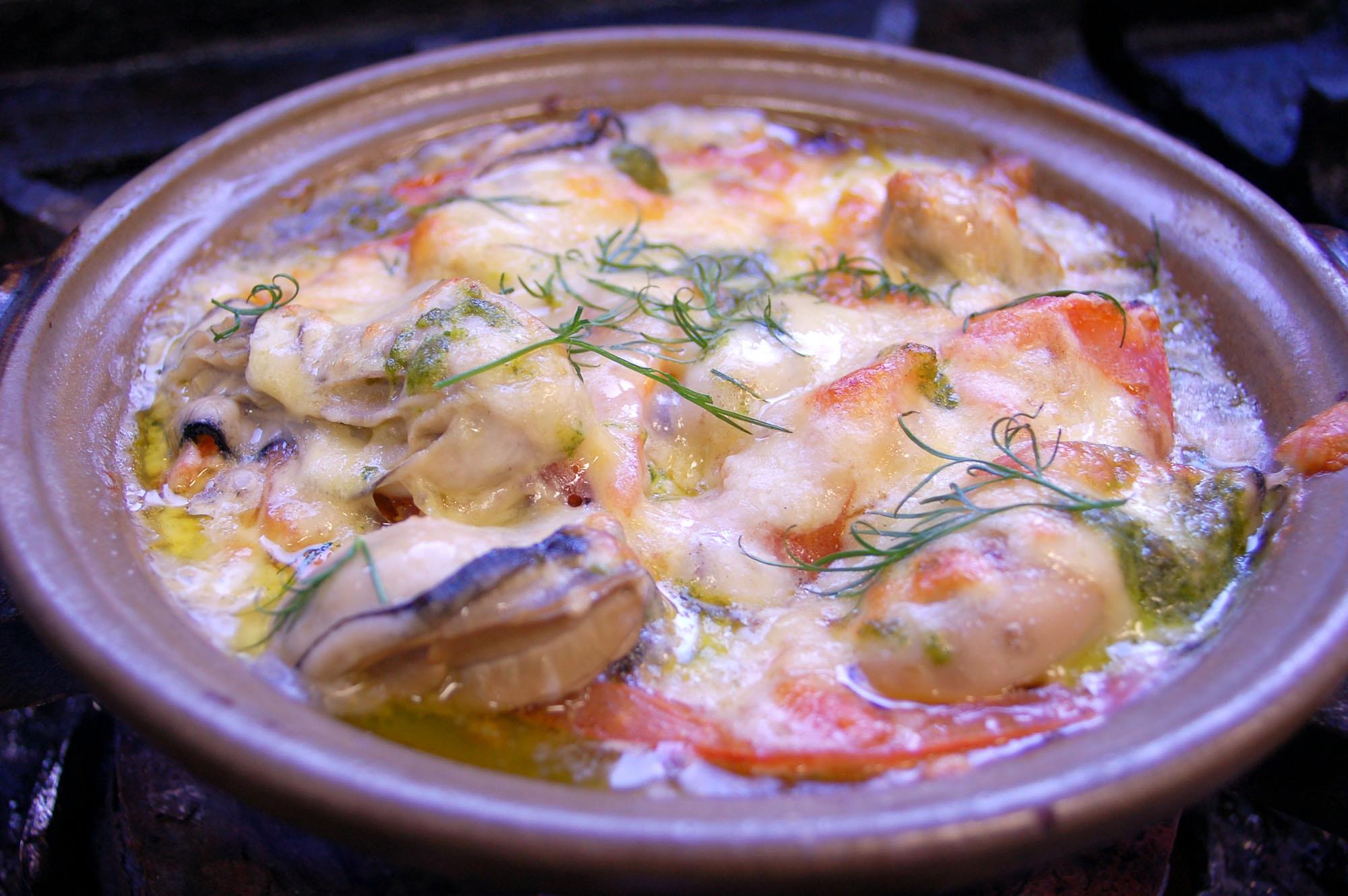 ☆冬の牡蠣(かき)はもうすぐ終わりです。 ☆冬の牡蠣(かき)はもうすぐ終わりです。 牡蠣フライに牡蠣鍋と大活躍した、冬の美味「牡蠣」。シーズンはもうすぐ終わりです。 写真は「牡蠣の陶板チーズ焼き」です。 トマトの上に牡蠣、チーズや香草で焼いた洋風な一品、オーブンで焼いた後、直火に掛け、グツグツ旨そうな香りがたまりません。 今の時期ならではな大粒でプリプリした食感をお楽しみください! 3月中旬までにぜひどうぞ。夏の美味「岩牡蠣」が出始めるのはまだまだ先になりそうです。 ツイート