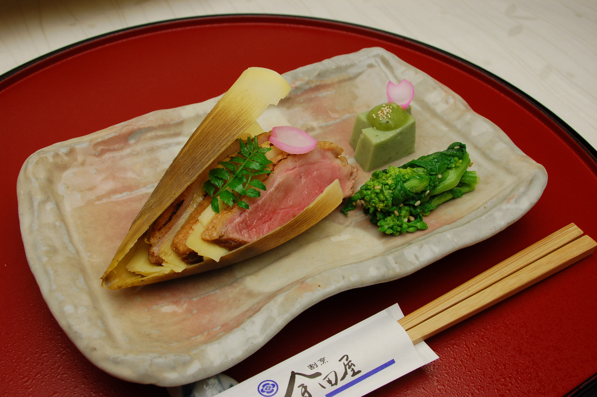 香りの高い筍が鹿児島県から出始めています。鴨と挟み焼きにしました。鴨はしっとり柔らかくレアに仕上げています。会席コースの焼き物です。