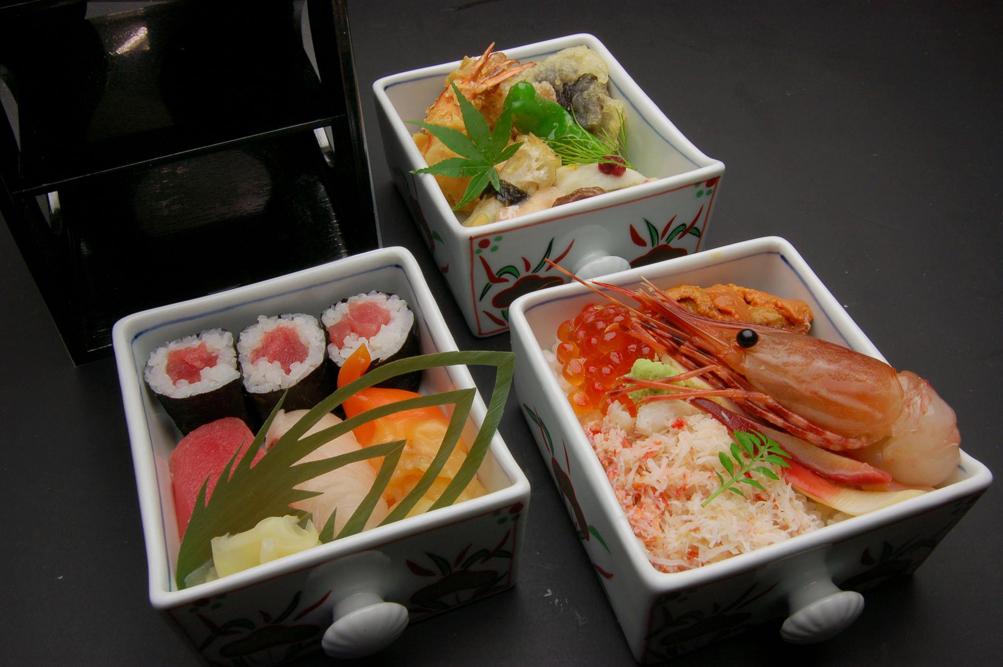 今日も暖かくなり、行楽日和ですね!いかがお過ごしでしょうか?そんな日に屋外で食べたくなる寿司弁当です。三段の引出しに収められた器には上から旬のお料理、握り寿司、北海丼となっています。とてもお値打ちメニューですので是非お試しください。