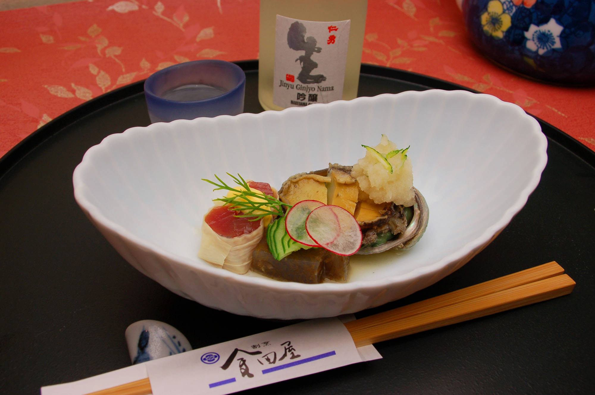 アワビの酒蒸し(柚子卸し) 鰹の東寺巻き(黄身酢) 新もずくゼリー寄せ 蛇腹胡瓜 ディル ラレッシュ